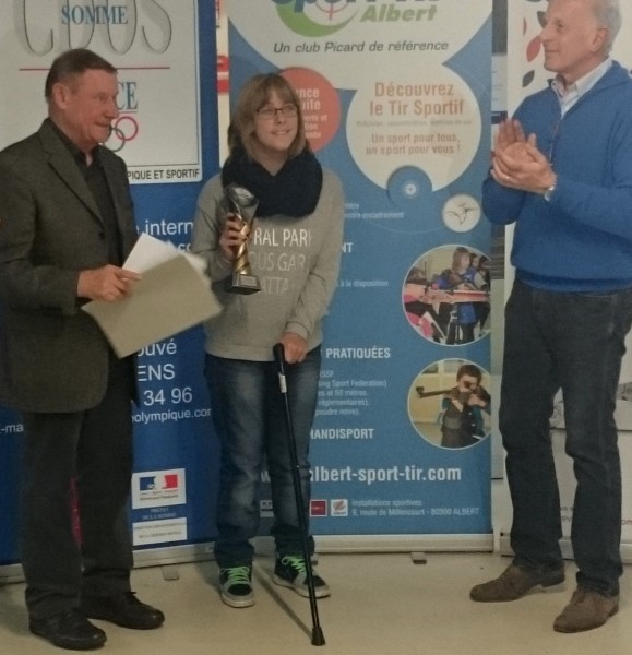 Après avoir été élue "Championne de l'année" lors de la soirée organisée par l'Office du Sport d'Albert le 13 novembre dernier, notre championne de France minime de Tir carabine Handisport 2014-2015, Justine Roueste, a été distinguée dans la catégorie "jeune" lors de la soirée des champions organisée le 27 novembre dernier à Pont de Metz par le Comité Régional Handisport et le 9 décembre dernier en recevant le challenge "Robert Brandicourt" décerné par le Comité Départemental Olympique et Sportif de la Somme qui s'est déplacé pour l'occasion dans notre club.