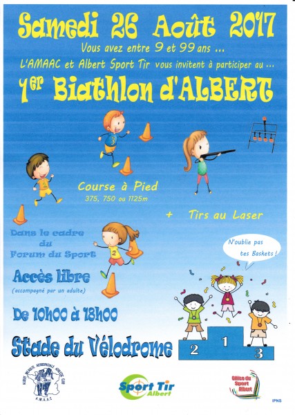 Albert Sport Tir participera le 26 août prochain, en coopération avec l’AMAAC (Albert Méaulte Aerospatiale Athlétic Club), à l’animation d’un biathlon au stade du vélodrome lors du Forum du Sport organisé par l’Office du Sport.