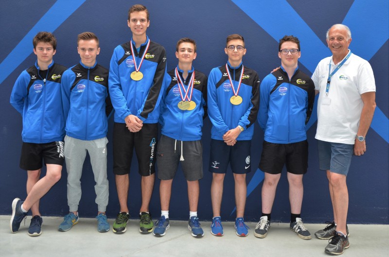 Antoine avec Théo DHENAIN et Aurélien DUREUX, s'adjugent ensuite le titre de Champions de France cadets par équipe en pistolet 50 mètres et montent, tous les trois, sur la plus haute marche du podium pour recevoir une superbe médaille d'or.