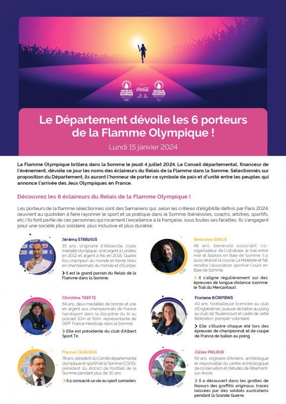 "Porter la flamme olympique le 4 juillet dans la Somme, un énorme honneur pour moi. Je remercie le Conseil départemental de la Somme et son président qui a porté ma candidature, les conseillers départementaux du canton ainsi que la municipalité d'Albert et mon club, Albert Sport Tir qui ont soutenu la candidature. Rendez-vous le 4 juillet pour ce bel évènement sportif" nous précise-t-elle.