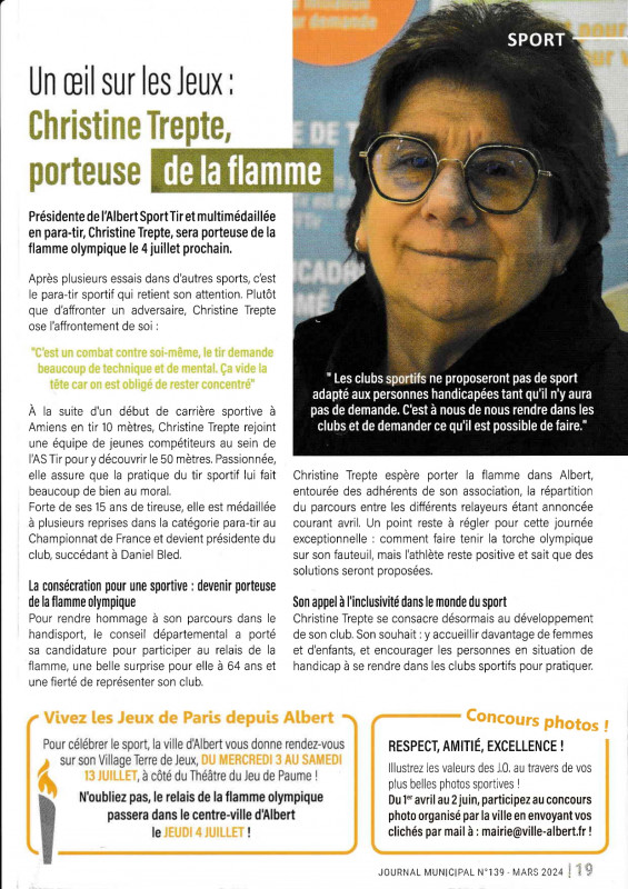 Christine TREPTE, notre présidente, qui portera la flamme olympique le 4 juillet prochain, a fait l'honneur du journal municipal...
