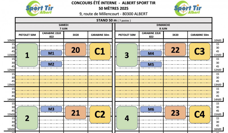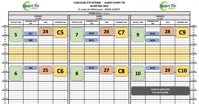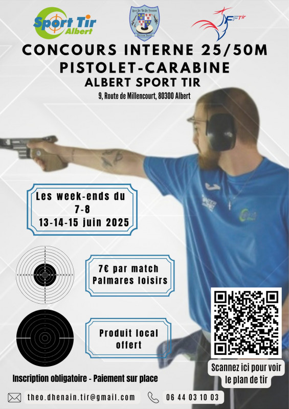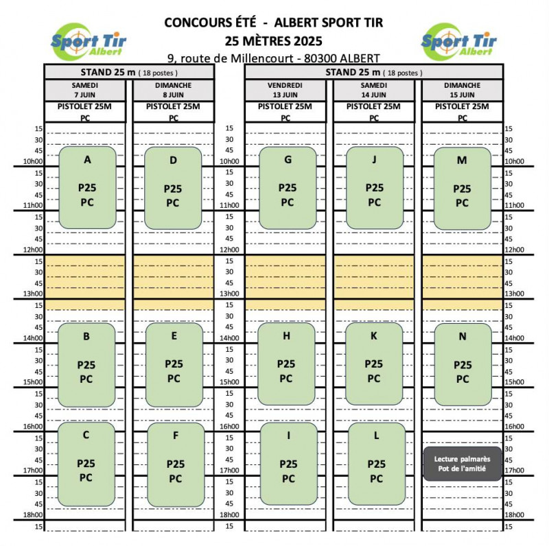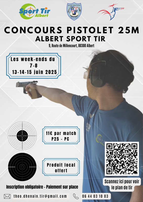 - Un concours 25 mètres (Pistolet 25 mètres et Pistolet Percussion Centrale) ouvert à tous les licenciés FFTir (Membres du club et Externes)